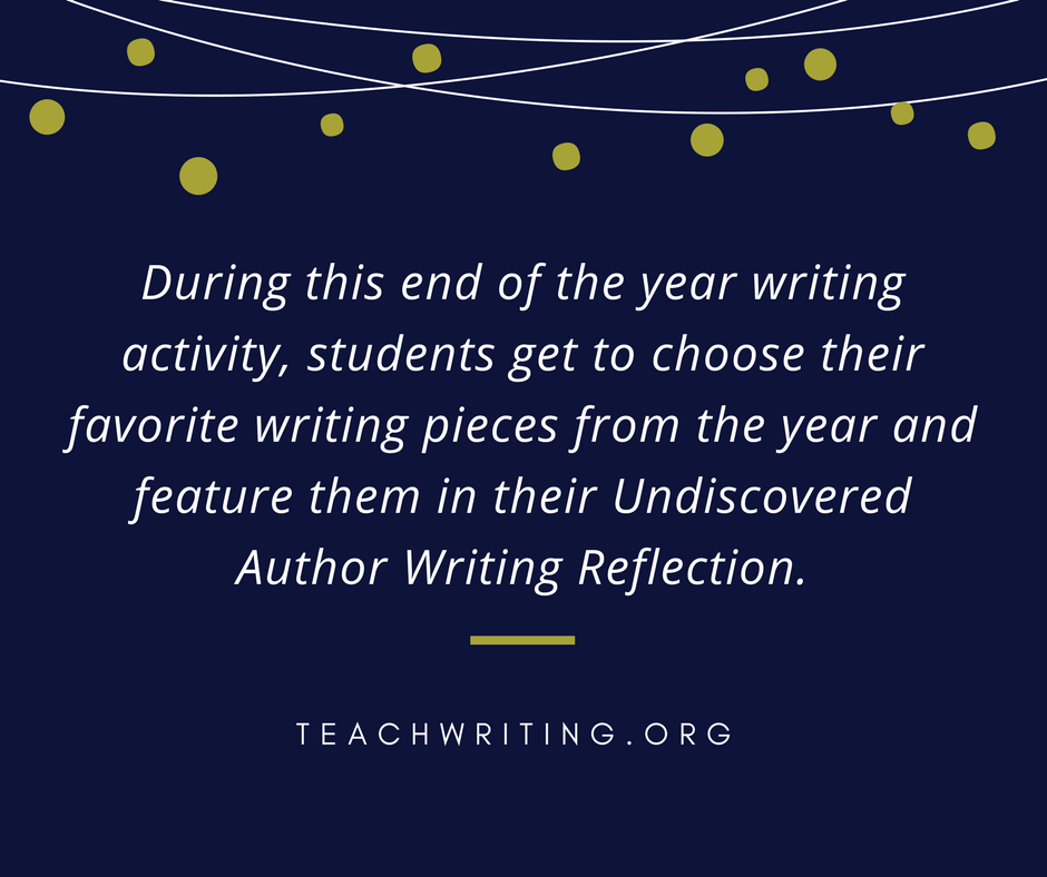 During this writing project, students go through their writing portfolios and review all their hard work. In my class, we type final drafts for most of our writing on iPads, so we have writing saved on the Pages App or in Google drive. This makes reviewing writing portfolios easy to access and look over. Students love looking back over all their writing for the year. They are often surprised with how much their writing has improved. During this end of the year writing activity, students get to choose their favorite writing pieces from the year and feature them in their Undiscovered Author Writing Reflection.