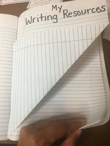 Block off 15-20 pages (this may vary depending on how many concepts you plan to give in charts and other resources) in the back of the composition notebook. You can use a paperclip or folded edge. Students will know that these pages are specifically used for reference materials. You can opt to use the front of the notebook, but I prefer to have student writing come first and reference materials housed in the back for extra support. Plus, if you have students glue charts within the notebook around their actual writing, it will be hard for them to locate a specific skill or strategy to use for future writing pieces. Here you can see how simple it is to fold an edge in the back of the notebook.